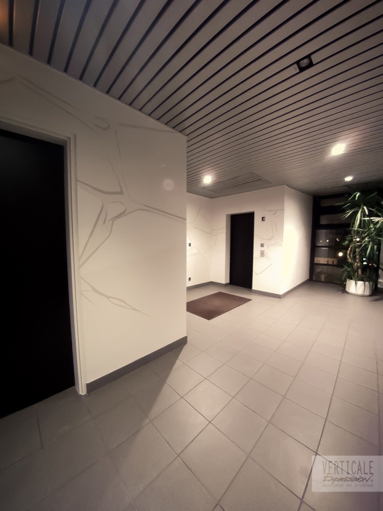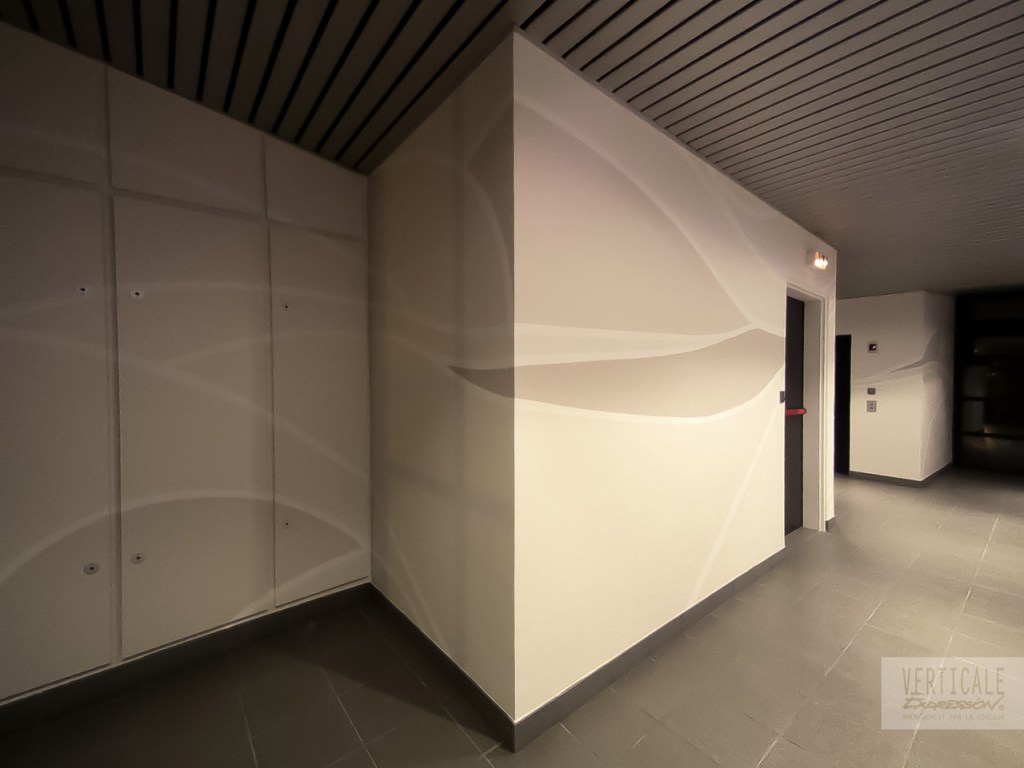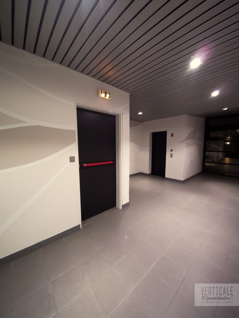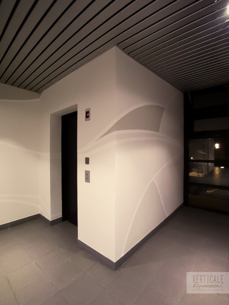 Fresques décoratives réalisées dans l’entrée et les espaces de circulation de cet immeuble de bureaux à Paris.