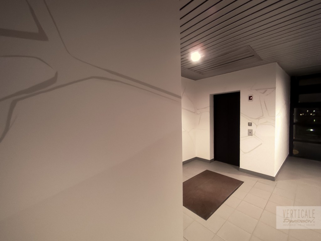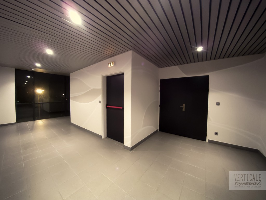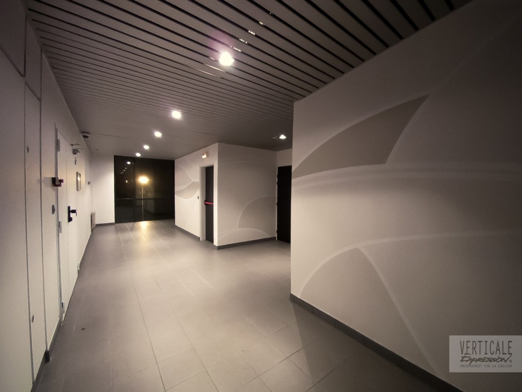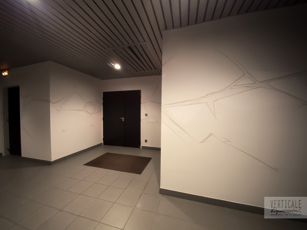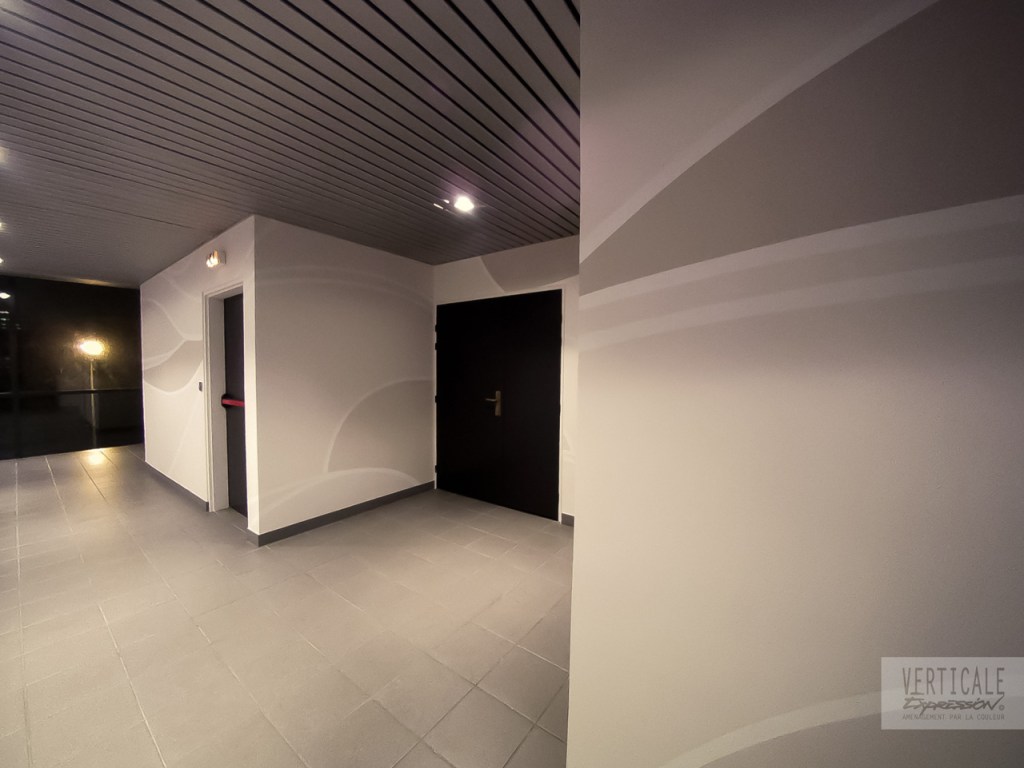 Fresques décoratives réalisées dans l’entrée et les espaces de circulation de cet immeuble de bureaux à Paris.